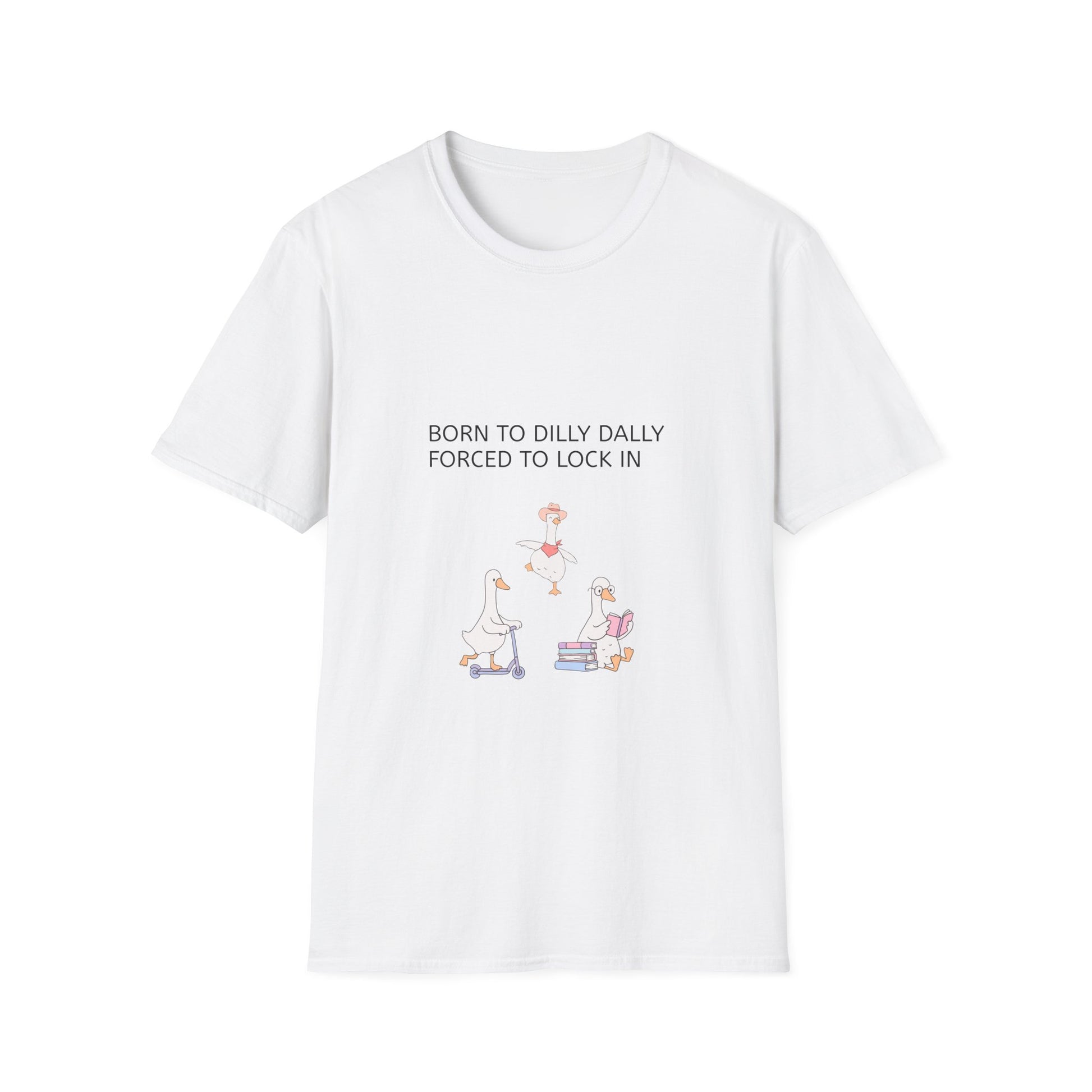Lightweight, soft, and printed with a playful scene, this classic crew tee carries a quiet, wry humor that slips easily into everyday life. The front illustration shows relaxed, bookish geese in gentle pastel tones with the line “BORN TO DILLY DALLY, FORCED TO LOCK IN,” a small reminder to slow down when schedules demand speed. It drapes cleanly in a classic fit, feels smooth against skin, and wears well through the seasons — a subtle companion for slow mornings, library afternoons, and mellow weekend walks. The understated design reads as both cozy and clever; it pairs naturally with jeans, cardigans, or a favorite cardigan for layered autumn looks.